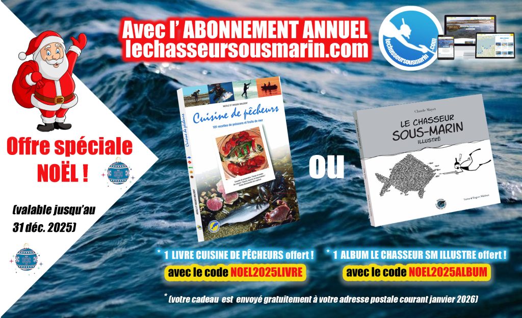 Jusqu’au 31 décembre 2025, cette offre vous permet de bénéficier d’un abonnement annuel au site à seulement 35,88 euros pour 1 ANNEE, avec un accès illimité au contenu payant/abonné du site 100% dédié à la chasse sous-marine : 330 zones & parcours (en France / Espagne / Angleterre), toute la réglementation générale en France et par département, la faune et les fiches espèces, les cales de mise à l’eau, les émissions radio en podcast « Mémoire de chasse »… et les délicieuses recettes de la mer toutes élaborées avec le produit de nos pêches !