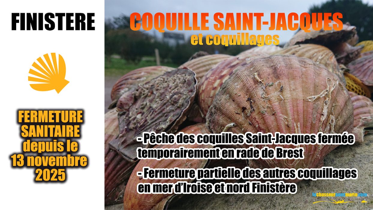 « Attention, aprĂšs seulement 10 jours d’ouverture… la PÊCHE de la COQUILLE SAINT-JACQUES (et de tous les pectinidĂ©s) est de nouveau FERMEE en RADE DE BREST depuis le 13 NOVEMBRE 2025, pour cause de contaminations phytoplanctoniques (des toxines amnĂ©siantes provoquant des vomissements, diarrhĂ©es…) !