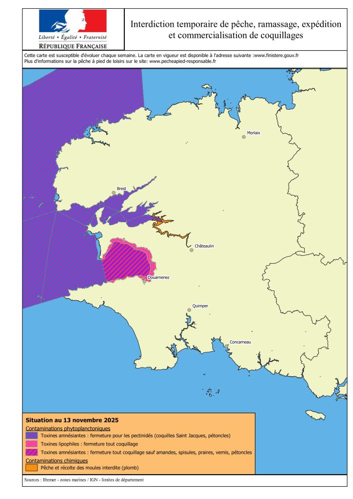 De mĂȘme, la rĂ©colte des COQUILLAGES est partiellement FERMEE pour raison sanitaire sur le littoral du FINISTERE s’Ă©tendant de la BAIE DE DOUARNENEZ au NORD-FINISTERE. »