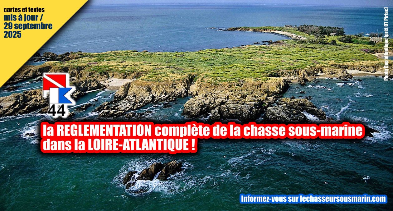 - 8 CARTES et TOUS LES TEXTES – de REGLEMENTATION DE LA PÊCHE SOUS-MARINE pour l’ensemble de la LOIRE-ATLANTIQUE ont été mis à jour en date du 29 septembre 2025 : ces informations vous permettent d’avoir une connaissance exhaustive des contraintes spécifiques à respecter en chasse sous-marine pour ce département. Pour les consulter facilement, elles sont regroupées selon les rubriques suivantes :