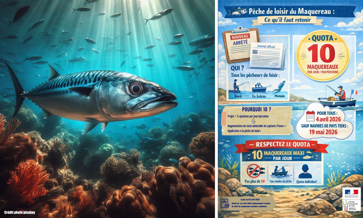 [Le nouvel arrĂȘtĂ© ministĂ©riel de la transition Ă©cologique, de la biodiversitĂ© et des nĂ©gociations internationales sur le climat et la nature en date du 1er avril 2026, entrĂ© en vigueur le 04 avril*, rĂ©glemente la pĂȘche de loisir du maquereau commun (Scomber scombrus) avec la crĂ©ation d’un quota de 10 spĂ©cimens capturĂ©s et conservĂ©s]