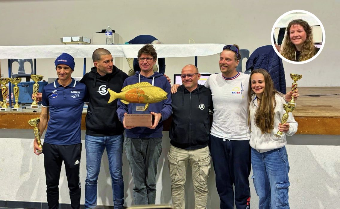 Photo du podium du trophée Ivara (de gauche à droite) : Marc Foyer et Guillaume Delphin (club Ailes Sportives Airbus Hélicoptère / 13) 2ème / Guillaume Eugène (club GASM Toulouse / 31) et Stéphan Foppolo (Harpon Club Agathois / 34) 1er / Valentin Galliéro (Cherbourg Pêche Apnée Club / 50) et Amandine Gomez (Harpon Club Audois / 11) 3ème En médaillon (en haut à droite) : Loane Paraboschi.