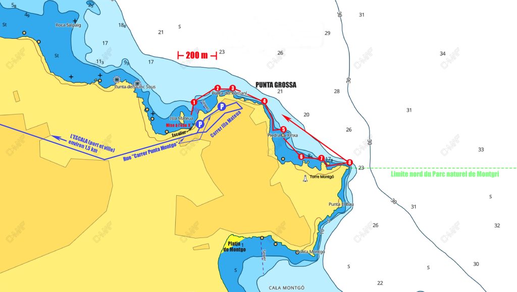 Au sud du port de l'Escala et au pied des hautes falaises du promontoire rocheux de Montgo, le parcours proposé suit la "Punta Grossa" et sa succession de pointes et de tombants pour arriver sur une large baie avec de jolis éboulis propices à la pêche à trou. Tous les poissons sont possibles : côtiers comme le sar ou le loup, prédateurs comme le denti ou la bécune et de roche comme la mostelle, le mérou et le corb !